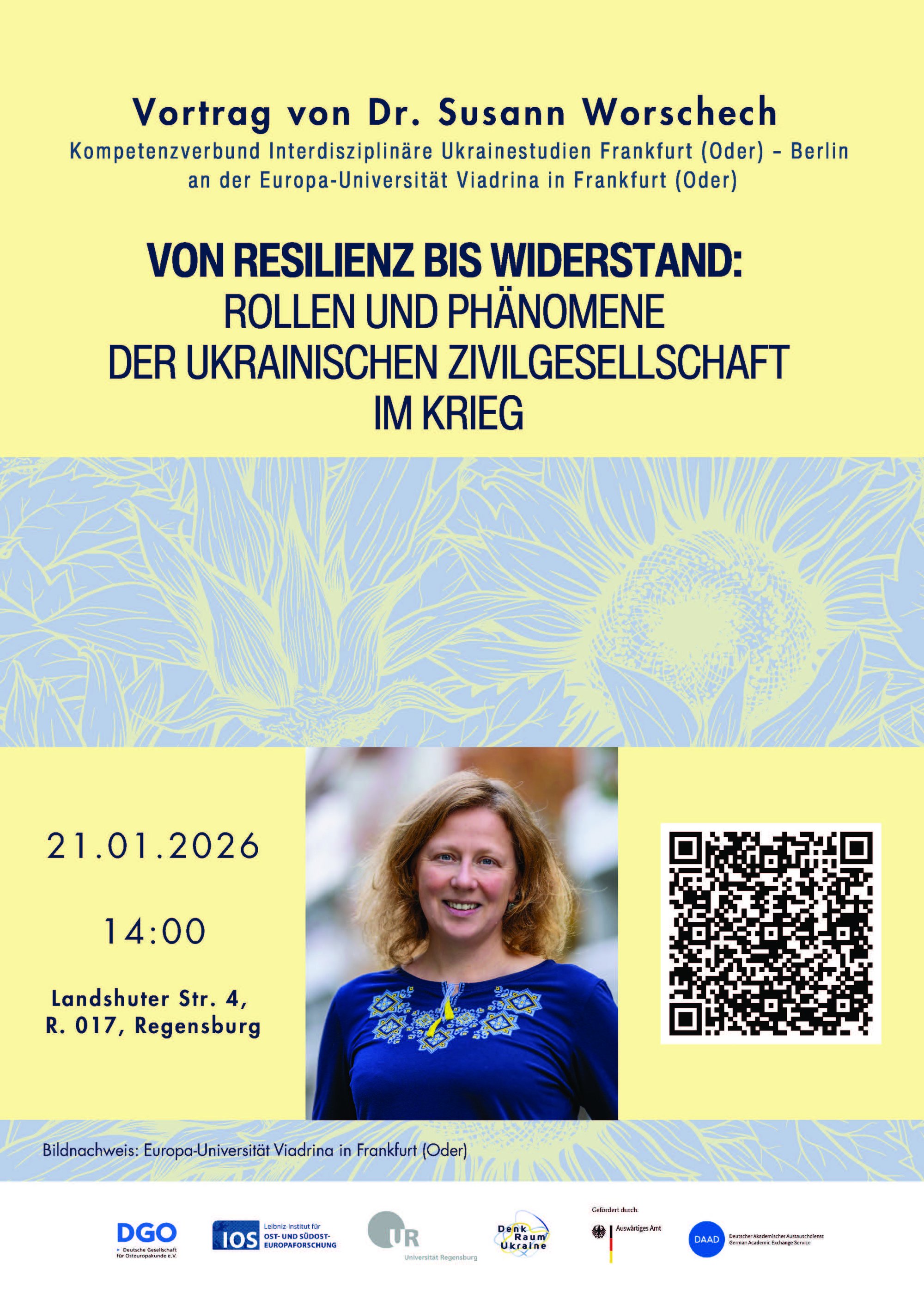 Veranstaltet von: „Denkraum Ukraine“ an der Universität Regensburg, gefördert vom DAAD (Deutscher Akademischer Austauschdienst) aus Mitteln des Auswärtigen Amtes (AA), Leibniz-Institut für Ost- und Südosteuropaforschung (IOS) Regensburg, Deutsche Gesellschaft für Osteuropakunde (DGO).